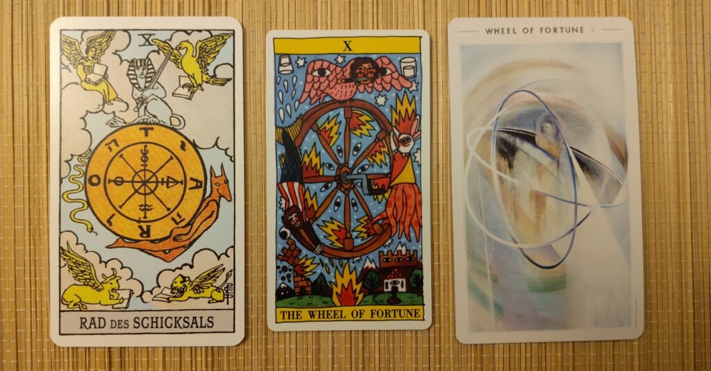 Im Waite-Smith-Tarot*, im Tarot del Fuego* und im The Fountain Tarot* sehen wir jeweils eine Form sich drehenden Rads. Während die klassische Illustration die Tiere der Evangelisten, eine Sphinx und ein mit hebräischen Lettern geschmücktes Rad zeigt, wird hieraus im Tarot del Fuego eine Art rotierendes Mühlrad der Zerstörung. Das Fountain-Tarot zeigt eher eine sich verschiebende, magisch-technische Sphäre oder ein Atom-Modell.