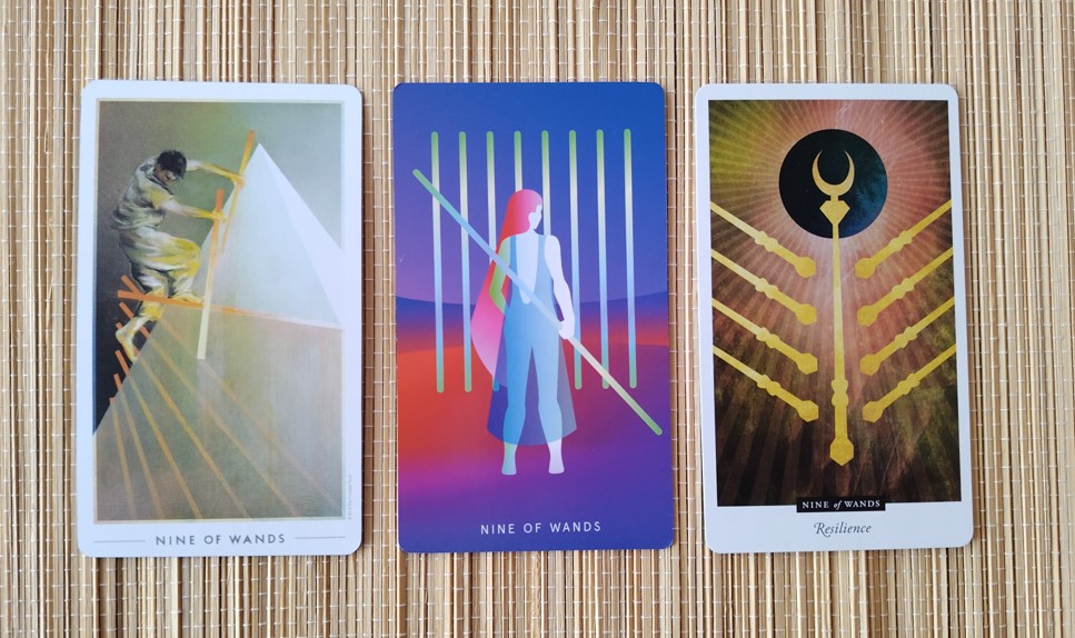 • Crowley-Harris-Deck („Stärke“): Crowley betont hier weniger das Abwehrende als das Positive der inneren Stärke, die sich durch Schwierigkeiten hindurch entwickelt. Die Neun der Stäbe ist ein Symbol für die Kraft, die durch Herausforderungen gewachsen ist. Die Karte repräsentiert die Kraft, die in den vergangenen Prüfungen erlangt wurde, und das Selbstvertrauen, das aus diesen Erfahrungen erwächst.
