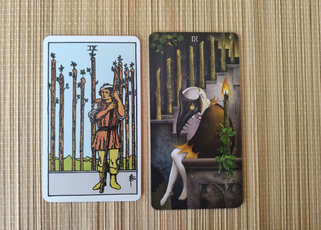 • Neun der Schwerter: Während die Schwerter hier mit Sorgen und Ängsten konfrontieren, zeigt die Neun der Stäbe die Bereitschaft, sich durch solche inneren Konflikte hindurchzukämpfen und gestärkt daraus hervorzugehen.